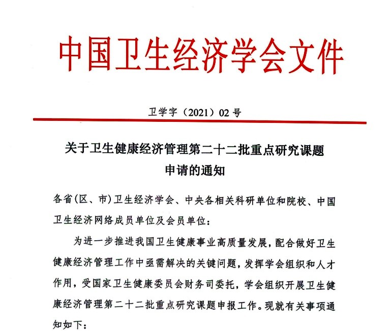 为进一步推进我国卫生健康事业高质量发展,配合做好卫生健康经济管理工作中亟需解决的关键问题,发挥学会组织和人才作用,受国家卫生健康委员会财务司委托,学会组织开展卫生健康经济管理第二十二批重点研究课题申报工作。