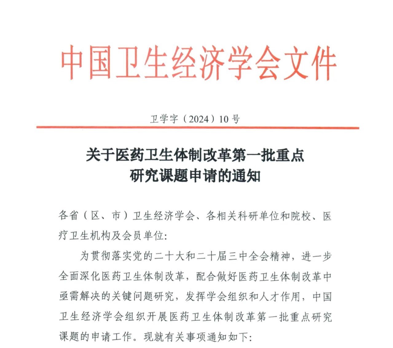 为贯彻落实党的二十大和二十届三中全会精神,进一步全面深化医药卫生体制改革,配合做好医药卫生体制改革中亟需解决的关键问题研究,发挥学会组织和人才作用,中国卫生经济学会组织开展医药卫生体制改革第一批重点研究课题的申请工作。现就有关事项通知如下:
